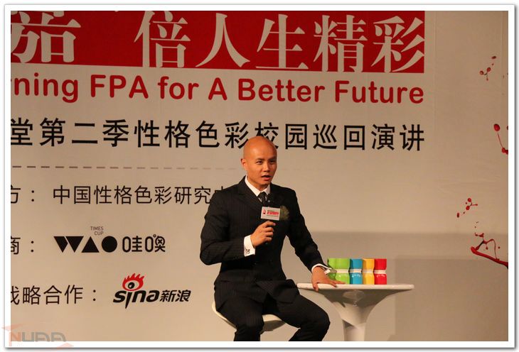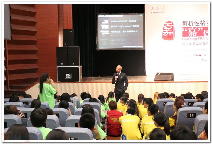 5月12日晚,“迎五四,致青春”青年偶像进校园系列讲座之乐嘉专场在将军路校区拉开了帷幕。本活动是“FPA嘉讲堂性格色彩”2014年全国大学巡回演讲的南京第一站。 活动开始之前1个小时,在小剧场门口同学们秩序井然地排队入场。主持人简单介绍后,乐嘉老师在同学们的掌声欢呼声中登场。讲座一开始乐老师就走下台和前排互动区的观众们开始互动。诙谐幽默的讲话风格点燃了现场同学们的热情。