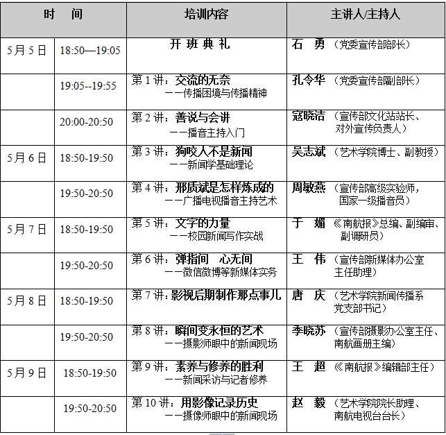 培训班5天的时间共安排了十讲内容,分别涉及新闻传播、播音主持、采访写作、摄影摄像、后期制作、新媒体实务等内容,基本上涵盖了新闻业务的各方面;主讲人来自艺术学院新闻学专业教师和学校宣传部一线业务指导老师,他们用大量生动的业务实例为同学们深入浅出讲述“新闻业务的那些事儿”,尤其值得一提的是,为提高课程的宣传度,吸引更多的同学来听课,培训老师除了精心准备培训内容外,还为每门课程起来了一个点睛的题目,如“交流的无奈”、“狗咬人不是新闻”、“邢质斌是怎样炼成的”,“弹指间 心无间”等。