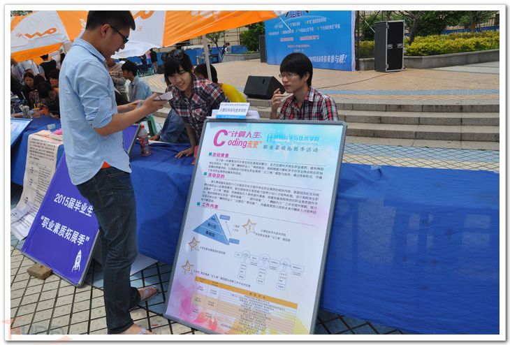 5月12日中午,“职通未来”—第八届南京航空航天大学“大学生职业素质拓展季”系列活动现场推介会在将军路校区举行,计算机学院2015届毕业生辅导员刘彦辰,带领学院就业工作组进行了学院“计算人生·Coding未来”活动方案推介。 在项目推介过程中,我院工作人员从活动的背景及意义、工作内容和活动安排对该方案进行了全方位的解读。该方案整体思想是以就业精英训练营形式分时段推进各类活动,针对同学们个人职业素质提升意愿,帮助其挑选相应的活动并鼓励学生参与其中,力图做到“私人定制”、“我的活动我做主”。我们也将为每位同学制作并发放拓展季活动参与情况记录卡,后期在拓展季闭幕式上将根据学生参与情况及表现进行“十佳学员”评比并进行表彰。推介会期间,我院还与其他学院就活动方案和开展思路进行了沟通与交流,在学习、了解其他学院职业素质拓展工作经验的同时,也对我院职业素质拓展工作进行了宣传,如“非诚勿聘”大型模拟招聘活动等,赢得了其他学院的一致好评,也为学院间合作打下了坚实的基础。推介会现场气氛热烈,不少同学来到我院展台参观交流,且均表示出了对我院制定的职业素质拓展计划的浓厚兴趣。