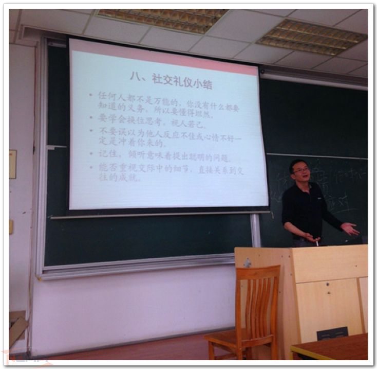 开篇的PPT以一个心理小测试开始,引起同学们的强烈的兴趣,同时也活跃起了讲座的气氛。杨易从人际沟通的定义,重要性,交流的各种心理与沟通的小技巧等方面为同学们作了讲解。他为同学们讲了各种交流的心理,如投射心理,晕轮效应,疑邻盗斧,自我预言等。图文并茂的PPT,加上杨易风趣幽默的风格,让整个讲座在轻松愉悦的气氛中进行。最后杨易以一些人际沟通的礼仪与技巧作结,为讲座画上一个圆满的句号。