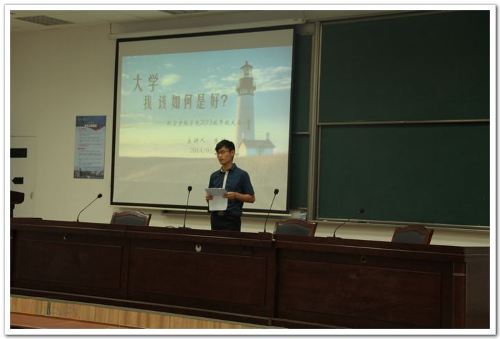 5月25日,航空宇航学院2013级在将军路校区举行 “大学,我该如何是好”主题月讲评,辅导员刘希以及全体学生参加,辅导员朱赫主讲。 月讲评以 “童年”、“在人间”、“我的大学”的人生线索为主线展开。在“童年”部分,朱赫带学生们回顾了入学一年来2013级新生们的变化。“我们读大学到底是为了什么?”的问题引发了同学们的思考。 “在人间”部分是本次月讲评的重点。辅导员朱赫通过展示不同年代最受欢迎职业的差异,说明了国家、社会等外部环境的变化对“成功的人生”定义的影响。然后朱赫引用了柏拉图和苏格拉底对话的故事,从一个哲学的角度向学生们解释了幸福的内涵。两个故事告诉了同学们面对外部世界持续的变化,只有拥有独立的人格,和内心深处的追求才能做到处变不惊,从而得到一生的幸福。朱赫向同学们介绍了2010级各院学生会主席以及他所在的0110108班全体同学的不同发展道路,向学生们展示不同的人生奋斗途径,鼓励同学们坚守自己高远的理想和追求。 在“我的大学”阶段,朱赫就如何应对外部环境、实现自我,如何寻找自己内心深处的追求给出了自己的建议:阅读。“虽然生命的长度不可控,但阅读可以增加我们人生的宽度,从而大大提高我们的人生扫过的面积。”朱赫向同学们推荐了《花非花》这本书,借用书中“成功只是优秀的副产品,优秀比成功更重要”的话告诫同学们不要过于追求功利。