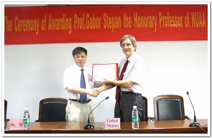 5月28日,我校举行了名誉教授授聘仪式。聘请布达佩斯工业与经济大学盖博·斯蒂芬(Gabor Stepan)教授担任我校名誉教授。校长助理熊克教授参加了聘任仪式,为盖博·斯蒂芬教授颁发了荣誉证书并佩戴了南航校徽。 授聘仪式上,熊克对加盖博·斯蒂芬的到来表示热烈欢迎,向参会嘉宾及我校师生介绍了斯蒂芬的学术经历和学术成就,并感谢斯蒂芬过去在力学系统动力学与控制领域对我校的帮助与指导,希望并相信斯蒂芬授聘我校名誉教授后,两校能进一步加强国际学术交流,拓宽科研合作领域,联合培养优秀人才,最终提升我校力学学科在国际力学界的学术影响力。 斯蒂芬对熊克的热情接待表示感谢,愿意积极为两校的合作搭建平台,促进我校相关学科的进一步提升和完善,推动布达佩斯工业与经济大学与我校的合作关系以及学科水平跃上新的台阶。 此次来访,斯蒂芬将为我校学生开设半个月《Dynamics of Computer Control Machines》的英语课程。 新闻链接:斯蒂芬是布达佩斯工业与经济大学应用力学系主任,曾任布达佩斯工业与经济大学机械工程学院院长。他是国际动力学与控制领域的著名学者,在国际力学界享有很高的学术声誉,是匈牙利科学院院士、欧洲科学院院士、国际理论与应用力学联盟IUTAM执委会委员及驻匈牙利代表,曾获得匈牙利最高科学技术奖Szechenyi Prize。 斯蒂芬长期从事力学系统动力学与控制的研究,在金属切削系统动力学、机器人动力学、时滞系统动力学等方面取得了重要研究结果,出版的两本英语专著被同行广泛采用,发表SCI期刊论文117篇,SCI他引1817次,H-指数为24。斯蒂芬和我校王在华教授共同主持了中国-匈牙利政府科技合作委员会项目(项目编号6-22,执行期2013.05-2015.04),为双方研究生和青年教授提供了密切合作交流合作的平台。斯蒂芬为交流合作提供了热情和卓有成效的帮助,取得了良好的合作成果。