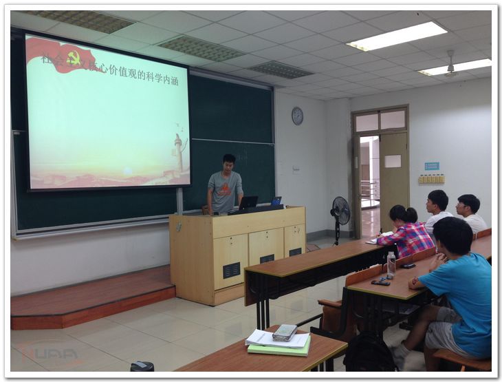 随后,第一党支部组织委员谭文帅同志就如何学习践行社会主义核心价值观作了主题演讲。他从价值观的概念,社会主义核心价值观的科学内涵,社会主义核心价值观的意义以及青年学生如何践行社会主义核心价值观等四个方面进行了具体的阐述,与大家共同学习了习主席提出的关于社会主义核心价值观的三个倡导,即“倡导富强、民主、文明、和谐,倡导自由、平等、公正、法治,倡导爱国、敬业、诚信、友善”,并结合近期的社会热点话题与同学们展开了讨论,加深了同学们在国家、社会、个人三个层面对社会主义核心价值观的理解及认识。同学们纷纷表示通过此次活动,进一步了解了社会主义核心价值观的内涵。
