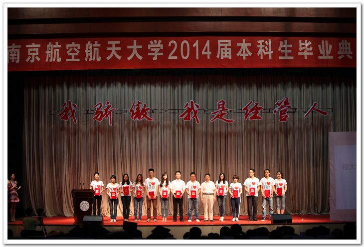 2014年6月20日晚,经济管理学院2014届毕业生典礼在将军路校区艺术中心小剧场举行。经济与管理学院院长周德群、党委书记李遥、副院长张卓、副院长朱建军、副院长王英、院党委副书记许静、专业老师代表、辅导员老师以及2014届全体毕业生参加了典礼。 毕业典礼以“我们永远是同学、我们永远是师生、我们永远是南航经管人”为主线,通过班长回忆、老师分享与10级的点滴、优秀校友寄语、校歌校训解读和院长寄语等环节,表达了学生对母校的感恩与依依不舍之情。