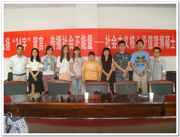 党的十八大以“三个倡导”24个字阐述的社会主义核心价值观,是社会主义核心体系的集中体现和科学表达。为了把“三个倡导”精神融入学习、生活和工作中,人文学院的博士生、硕士生代表在研究生辅导员尹春苹的带领下,立足实际,积极组织开展弘扬“24字”箴言,传播社会正能量的系列实践活动,暑期内,将组织进学校、进社区、进企业等全方位、多层次的宣讲和实践活动,着力推进宣教引导、主题承载、典型示范、文化建设、实践养成,力求使培育和践行社会主义核心价值观活动取得积极进展。