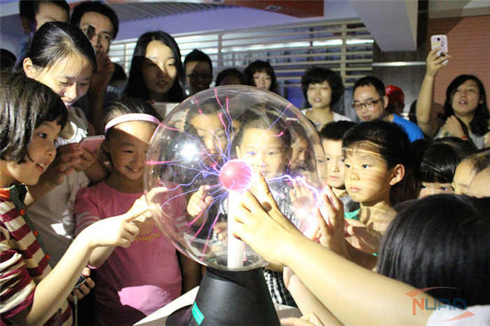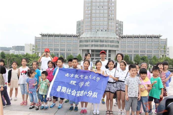 神奇的辉光灯,先进的全息成像,闪电般的雅格布天梯,风洞模型,常温磁悬浮……你了解吗?想看吗?这些“藏匿”在实验室的科技发明,今天终于有机会亮相了。南京航空航天大学理学院长期立项的实践活动——大手拉小手,走进i.e科普小站,7月6日队长李松及12位志愿者带领24对亲子游南航,做手工,并在潘琦老师的带领下参观了理学院国家物理实验室。 游南航,小小人树大志向 早上8点半,24对亲子组合在南航北门集合,行走路线是北门——樱花广场——灯光广场——灯光大桥——大飞机停机场——砚湖——理学院,涵盖了南航著名的“景点”,沿途队长李松给家长小朋友们讲解南航的历史,队员们“一帮多”解答小朋友们千奇百怪的问题。“你们知道灯光广场还有个什么名字吗?……光棍广场,一个是因为这些灯柱孤伶伶的像是光棍,还有一个原因是南航是工科院校,男女比例可是7:1啊,不过帅哥美女可多啦!” 走到灯光大桥上,志愿者曹凯以南航主楼为背景,为24对亲子拍照留念,将孩子们天真无邪的画面定格在相机里。这时一个孩子说,“对面是图书馆么,好气派呀,我以后能不能在这里上学呀。”