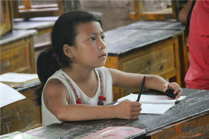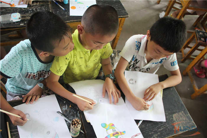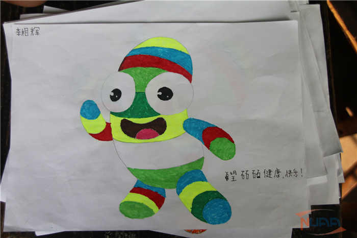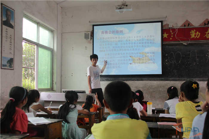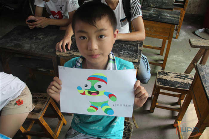 在青奥课堂上,支教团团长周剑刚带着孩子们共同了解了青奥会的由来、青奥精神的涵义以及南京青奥会的主题和吉祥物等相关知识,在让孩子们更多地了解青奥的同时,引导孩子们理解青奥精神,提高孩子们对体育运动的热情。之后,孩子们纷纷拿起画笔,在小老师的指导下给青奥吉祥物“砳砳”的画像上色,看着笔下的卡通形象随着自己一笔一笔描绘而变得活力四射,孩子们的脸上满是兴奋。
