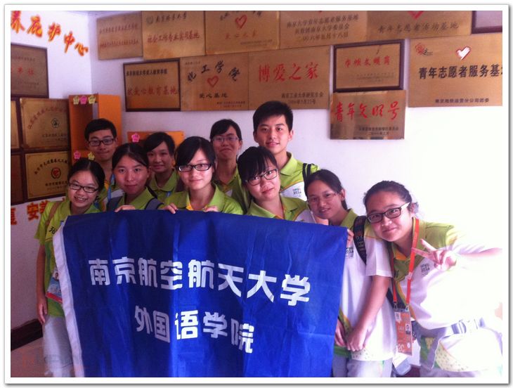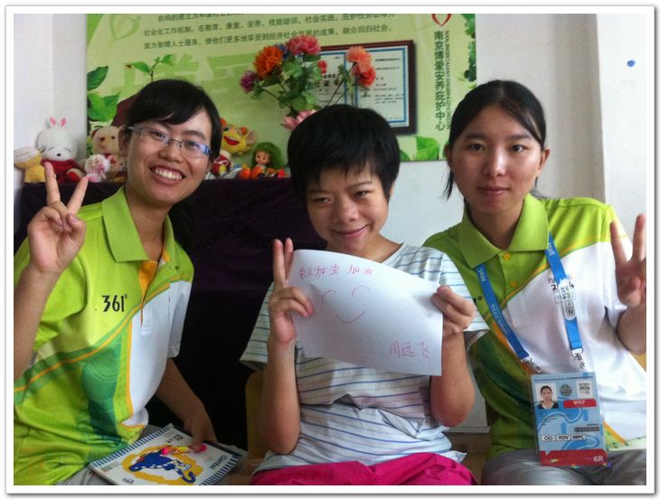 8月5日,为了进一步传播青奥文化和各国礼仪文化,他们走入南京博爱安养庇护中心,这里有一个特殊群体——智障人士,他们没有追求幸福的能力,却有渴望幸福的心。在这天中,团队学员们共同了解青奥会的精神和各国礼仪文化,一起学习礼仪操。之后,很多学员们在纸上写下了“青奥”“南京”“加油”,其中有些学员根本不会写字,但是仅仅只是画出一个笑脸,一个五环,也足以表达他们内心的开心之情。最后,学员们和志愿者们一起录下“我在这里,为南京青奥加油”的视频,献礼青奥。