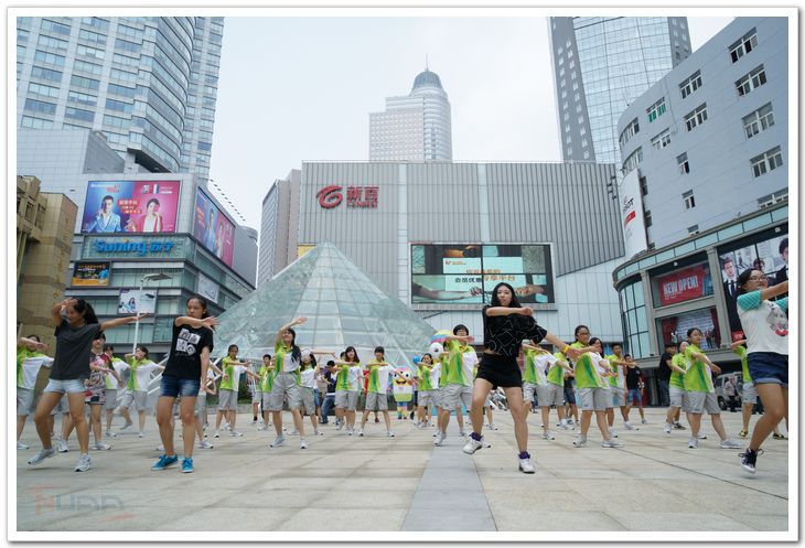 在距离青奥会开幕式倒计时只有11天之际,南京地标中心新街口街头迎来了一场街头“快闪”。8月5日上午,在新街口莱迪广场正中央,一名身着志愿者衣服的同学缓缓拉起小提琴曲《卡农》。悠扬的小提琴之后,充满韵律感的音乐忽然响起,四名青奥会志愿者跳起机械舞。路边行人眼光都聚焦在舞蹈同学身上,纷纷驻足围观,现场气氛达到一个小高潮。紧接着,更多的志愿者或者行人加入“快闪”队伍中去,与此同时,青奥会吉祥物——砳砳也在队伍中和大家一起歌舞青奥,歌舞青春,动感的音乐,有节奏的舞蹈将现场的气氛引爆。据悉,此次街头“快闪”行动是南京航空航天大学外国语学院志愿者自发组织,吸引了共有来自10余个学院的近70名志愿者参加,他们想通过这样的“快闪”行动预祝青奥会圆满成功。