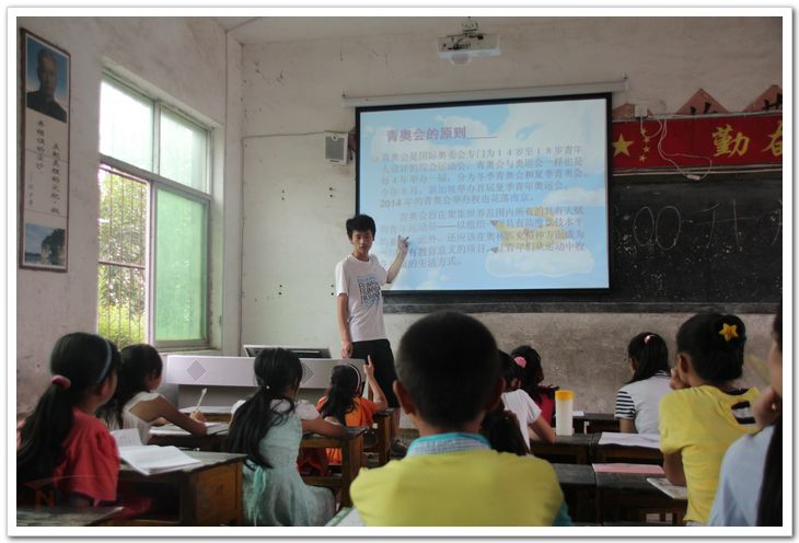 在赣州,团队开设“青奥课堂”,同“砳”同话成长。 在青奥课堂上,支教团团长周剑刚带着孩子们共同了解了青奥会的由来、青奥精神的涵义以及南京青奥会的主题和吉祥物等相关知识,在让孩子们更多地了解青奥的同时,引导孩子们理解青奥精神,提高孩子们对体育运动的热情。之后,孩子们纷纷拿起画笔,在小老师的指导下给青奥吉祥物“砳砳”的画像上色,看着笔下的卡通形象随着自己一笔一笔描绘而变得活力四射,孩子们的脸上满是兴奋。