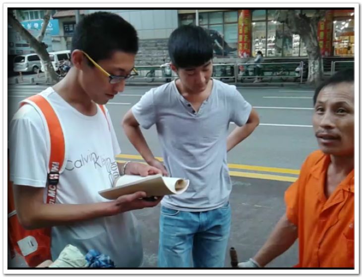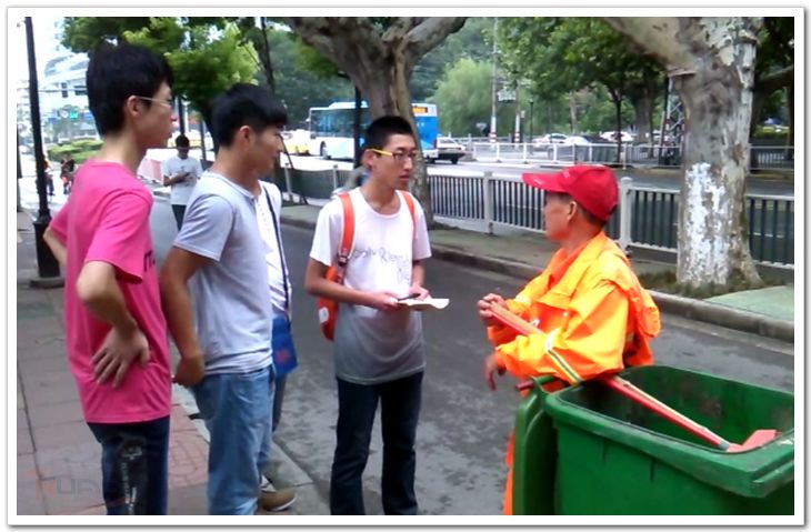 起初,同学们的采访遭到环卫工人婉拒,但是这难以阻挡同学们的热情。活动过程中,队员们走街串道,寻找环卫工人的身影,主动地上前询问有关环保方面的问题。而他们也热情地介绍自己的工作时间、工作强度、工作待遇以及切身体验和认识。当他们提及到自己每天工作十多个小时,一个团队成员就问:“那您感觉特别累不?有没有感到特别无聊甚至忽然萌生想放弃的念头?”环卫工人微微一笑说道:“其实不怎么累,每天路上垃圾最多的时候就是早上上班时,等过去以后基本上垃圾就很少见了;你们不知道,路边有垃圾桶,绝大多数市民都不会随手丢弃废物,这给我们省了不少事。”在整个过程当中,队员们看出了环卫工人对工作认真负责的态度和对周围人环保意识的肯定;通过对他们的工作强度的了解,队员们深深地感受到他们为维护整洁的市容所付出的心血。整个采访也受到周围人的关注,借此机会,队员们向他们宣传了环保知识。