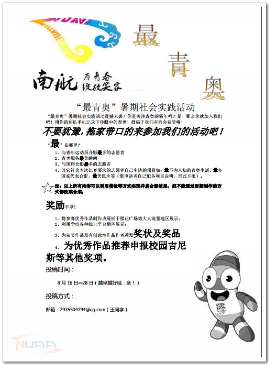 “志愿服务精神是追求和谐、和爱、高尚、奉献、利他的人类文明境界!奥运会志愿者是联系社会和奥运会的桥梁,增加了和谐社会的亲和度与凝聚力。志愿者行动促进了社会和谐与进步!”——这铮铮誓言向人们诉说着小青柠们的无悔付出,他们甘做幕后英雄!在大多时候,赛场上摄影师的镜头总是全部聚焦在运动员身上,却很少关注那些默默无闻的志愿者,于是南京航空航天大学“最青奥——志愿者眼中的南京青奥会”社会实践活动便应运而生了。