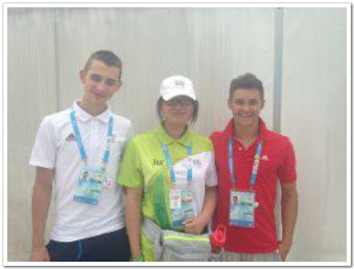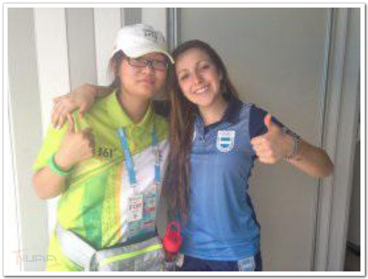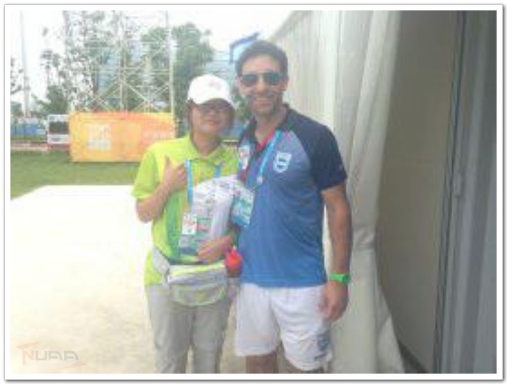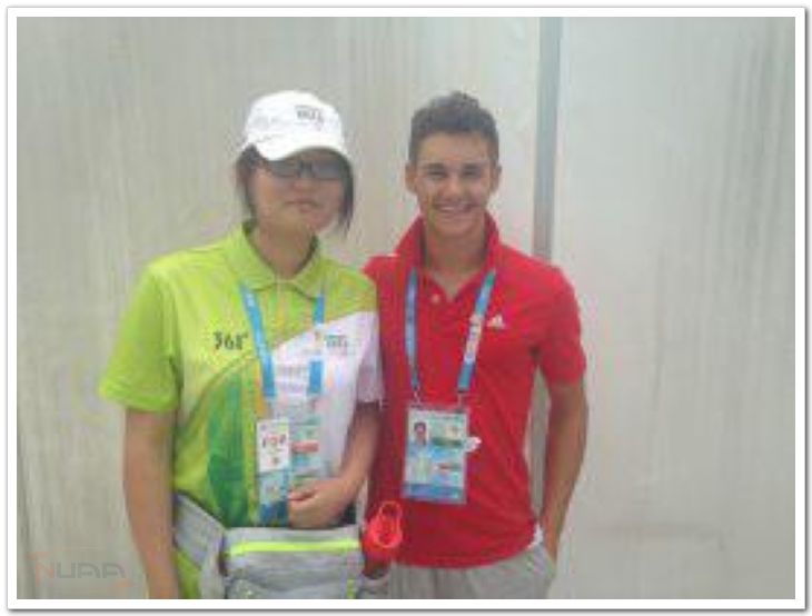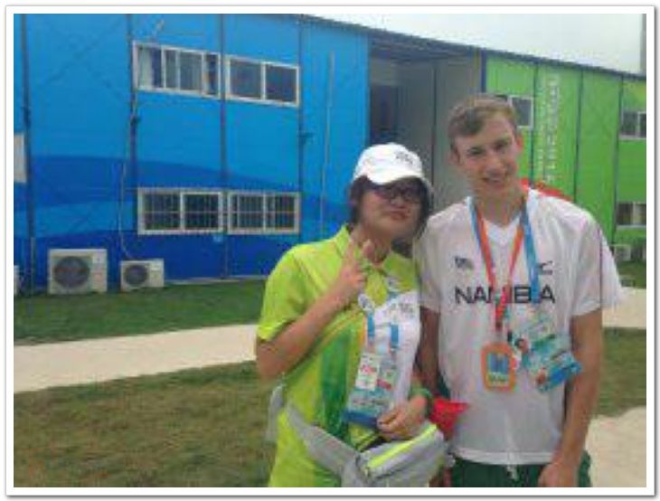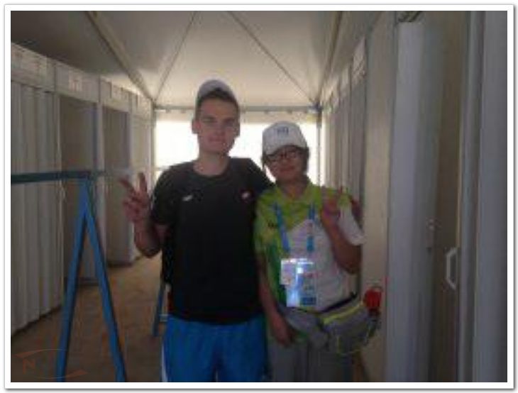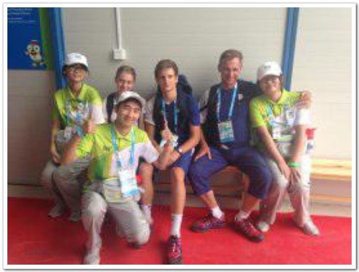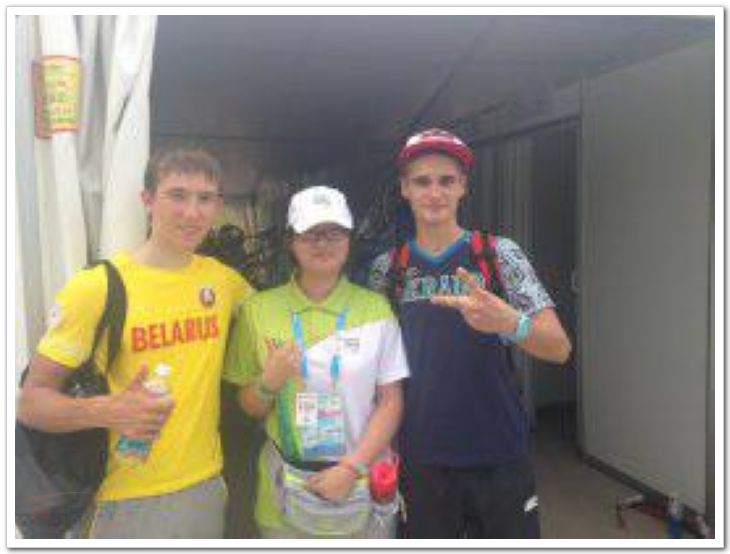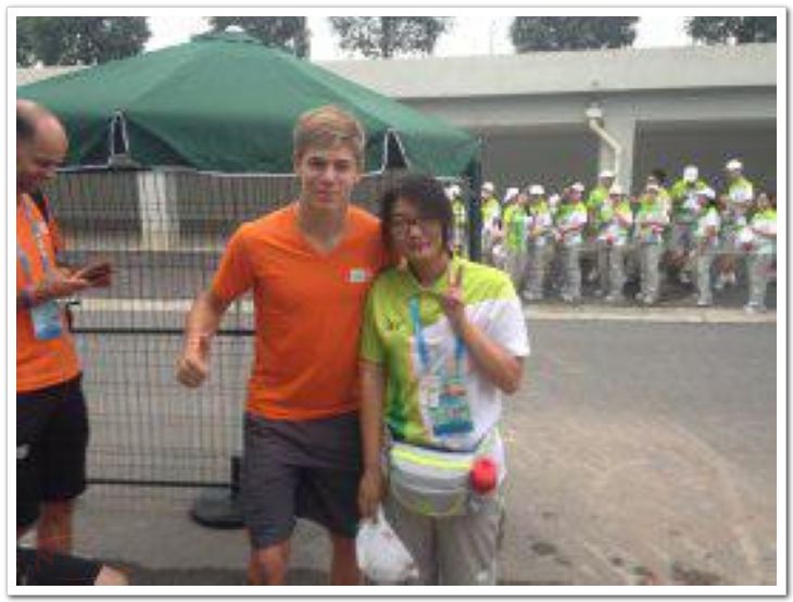志愿者在为青奥会奉献的同时也成为联系中国与世界各国的纽带,秦同学与来自各国的几十位运动员合影留念