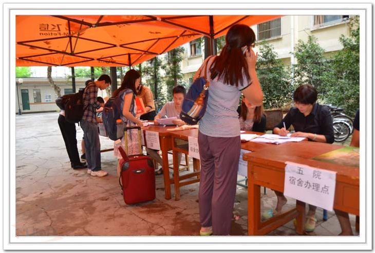 学生处将新生报到工作点设置到各宿舍楼,考虑到在宿舍楼中进行集中大量的发卡录入工作可能导致的一系列安全问题,给新生以最方便的贴心服务,公寓服务中心积极配合好学校的迎新工作,妥善在各宿舍楼下安排好报到场地,抽调大量工作人员为新生及时办理住宿手续,公寓阿姨们连续奋战在一线,维持秩序,确保楼内安全,24小时的值班管理保证每一名新生到校就能入住,为迎新工作的顺利展开打下坚实基础。