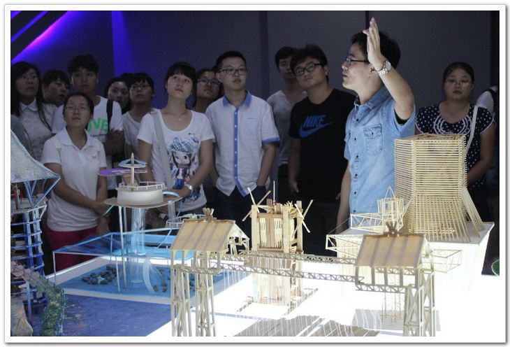 新生首先观看了关于我校近年来在发明创造方面取得优异成绩的视频,欣赏展厅照片墙上的南航学子们历年参加国内外大赛的照片。随后,芮康康又向新生介绍了航空航天、材料科技、能源动力等领域的发明创造,并讲述了艰辛的发明过程。值得一提的是,展厅内除了理工科学子的发明创造外,还有很多是往年“微创意,微创新”科技节期间由文科学生制作的展品。这些文科生的展品让学院新生啧啧称奇的同时,也鼓励着他们自己能够在未来的创新创意活动中取得成就,实现文科生的创新梦、科技梦。最后,芮康康向新生展示了我校学生自己发明创作的数字灯光水幕。这一展品从萌生创意到制作完成,耗费了近六年的时间,让新生们体会到了发明创造的艰辛和不易。