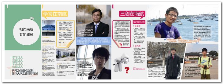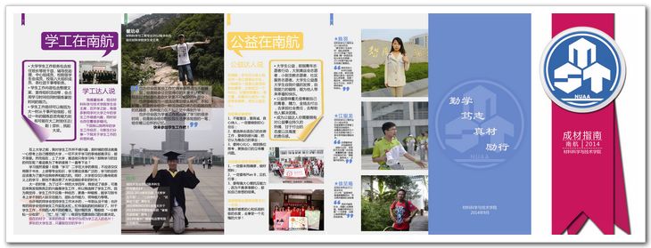 为迎接2014级新生的到来,材料科学与技术学院团委、学生会利用暑期时间精心制作了一份《成“材”指南》,帮助新生明确大学发展路径,缩短中学与大学间的转型期。 该指南以“相约南航,共同成长“为主题,分为“学习在南航、三创在南航、学工在南航、公益在南航”四大模块。这四大模块也是学生大学发展的四大主要路径。它们分别向新生解释了大学学习、科技创新、学生工作、志愿服务究竟是什么,怎么做的问题。同时针对每一个模块,《成”材”指南》列举了2-3个学院中最具代表性的学生:有大学成就奖获得者朱雅亮、第九届“中国青少年科技创新”奖获得者申来法、在最基层的班长工作中带领班级获得省级优秀班级称号的学生骨干钱伟,还有我校唯一的江苏省十佳志愿者陈羽等。
