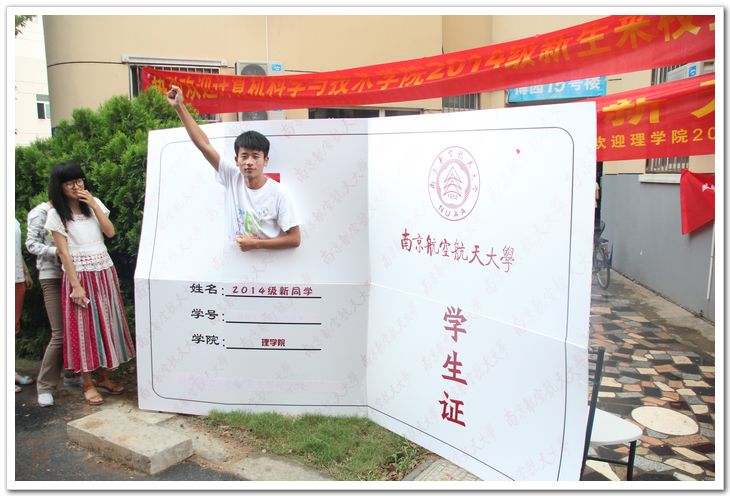 “开创属于你的理学生涯”是悬挂在理学院的各个迎新点的横幅,它作为贯穿学院2014级迎新工作的主线,学院通过了“发现理学”、“深入理学”、“爱上理学”等系列活动,鼓励理学学子在理学的道路上一路前行、奋勇向前。 在大学里,每一个学生都会有一张属于自己的学生证,但理学院却让这独一无二变得妙趣横生。当一个长3米,高2米的超大学生证出现在将军路校区宿舍楼下时,新生们就争相在学生证旁拍照留念,将大学第一张青涩的笑脸定格在了那个瞬间,调皮的新生甚至穿过学生证,为原本二维平面的证件创造了立体感。为了满足其它学院同学拍照留念的愿望,学院还特意制作了十三个学院的名称供新生更换,让更多的学生加入到爱院,爱校的行列中来,让新生们的大学生涯从自己的第一张笑脸开始。 9月3日下午,理学院党委书记余春玲、党委副书记王静在2014级新生辅导员周佼佼、黄博伟的陪同下,冒雨前往学生宿舍看望新同学。余春玲询问每一位新生的姓名和家乡,关心他们是否适应南京的气候,并叮嘱他们在学习和生活中遇到困难都可以找学院老师寻求帮助等,同学们表示非常感动。 理学院还利用学院微信平台推送了“导师团”酷炫宣传海报,利用这种学生常用的途径,让不同职能的辅导员们集体亮相的方式得到了学生们的热烈追捧。本次迎新活动在新生中取得良好的反响。