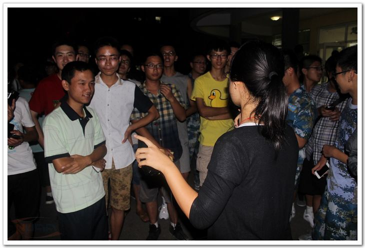 9月8号,中秋佳节,猜灯谜环节办得也是有声有色。现场布置得很温馨,地面上用气球摆成心形,四周围上了彩灯,挂起了大红灯笼。关上灯,微微灯影下猜灯谜,别有一番意境。猜灯谜中,同学们充分展现了聪明才智。赢家们领走了主办方精心准备的奖品——明信片。该系列明信片是学长学姐们自己制作的,以新生们的故乡为背景,结合中秋思乡元素,让新生把思念寄回家。还有就是,活动中的亮点,请到了军训的教官,教官们打拳展军姿,同学们高声喊拉歌。现场一度达到了高潮,教官,同学们一同庆中秋。 最后,是游园会环节。学姐们带领着新生们游逛校园,告诉他们关于南航校史,关于各个场馆的地理位置及作用。对于刚刚入校还不是很熟悉校园的新生们来说,这真是一个很好的经历。