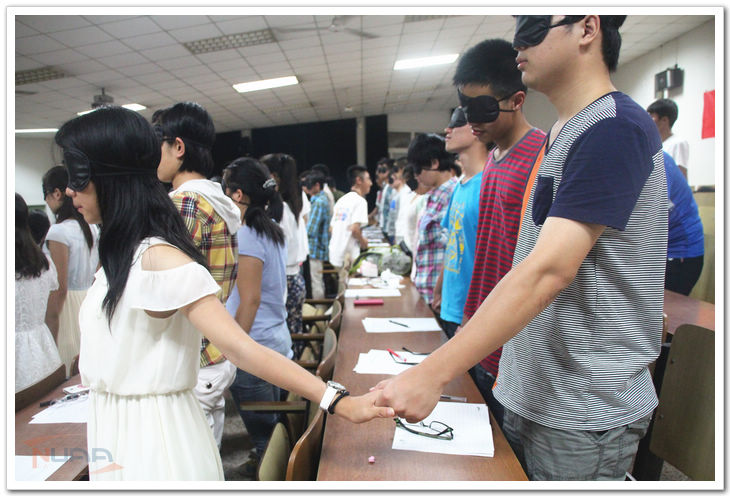 活动一开始,新生辅导员黄博伟老师精心安排了一场名为“生命之旅”的素质拓展。所有新生分成四组,蒙住双眼,手牵着手,在军训教官和几位同学的指导下围着教室外草地和楼梯绕行。“希望他们去感受到牵手的力量和被保护的感觉。用他们的双手去感触,用耳朵去倾听,用心灵去感受。”在现场可以看到所有人的手都紧紧地握在一起,小心翼翼地前行着,时而弯腰,躲过头上的树枝,时而变道,跨过脚下的障碍。有学生表示:“这种感觉很奇妙,我们彼此依靠着,不敢放手,仿佛他们就是我的家人一样,我们一直在一起。”