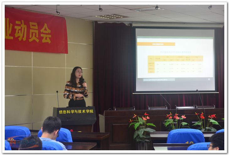 最后,王霄对就业进行了整体动员。她对2015届毕业生就业形势进行了分析,并对学生们提出了建设性的建议。她首先简要介绍了学院2013届就业工作在就业率、升学出国率、国防单位就业率等方面的情况,让学生有一个比较好的参考和充足的信心应对今年的就业形势。然后建议大家开阔视野,了解更多的单位,在了解比较的基础上做出最好的选择。其次,她帮助大家分析了计算机专业毕业生当前就业形势和现在面临的问题,并给与了学生们耐心的指导,让学生对自己有一个明确的定位和良好的评估,正确认识当前形势、认识自我。最后,她鼓励学生在严峻的就业形势前不气馁,动员学生积极面对就业形势,为之后的就业做好充足准备。