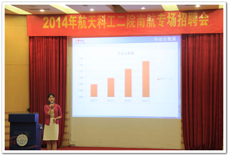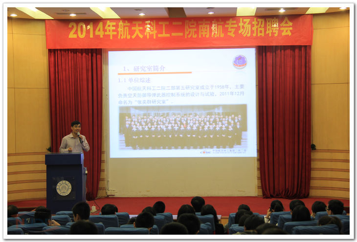 10月14日,中国航天科工集团第二研究院南航2015届毕业生专场招聘会在我校明故宫校区举行,航天科工二院16家用人单位的领导和招聘人员参加了宣讲活动,校学生处副处长、就业指导服务中心主任许爱华出席并致辞。 下午3:00,宣讲会在逸夫科学馆报告厅召开,许爱华为本次宣讲会致欢迎词,之后航天科工二院人力资源部主管张永恒全面细致地介绍了单位的总体情况,并热情欢迎我校优秀毕业生加入科工二院大家庭。最后,我校校友、曾在自动化学院精密仪器与机械专业就读的刘大军主任向在场同学分享了自己的职业生涯发展路径。宣讲会结束后,16家单位在科学馆大厅开展现场招聘,广大有意向进入二院的毕业生积极应聘。