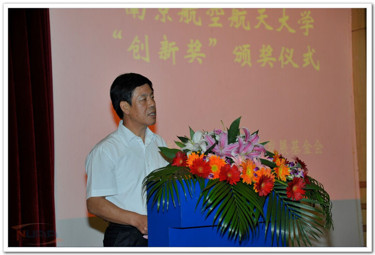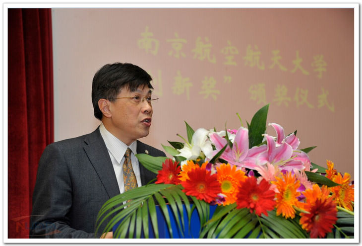 10月18日下午, 南京航空航天大学“创新奖”颁奖仪式在明故宫校区逸夫科学馆报告厅举行。校长聂宏,校党委副书记、副校长、校基金会理事长陈夏初,陈达院士,朱荻院士,校发展联络部部长、教育发展基金会秘书长孙建红,我校1980级校友、佳辰(香港)股份有限公司董事长蔡奎以及来自全国各地的校友代表出席了颁奖仪式。仪式由校长助理熊克教授主持。 陈夏初在致辞中阐述了南航的创新平台发展以及具有南航特色的人才培养模式和理念。近几年学校创新成果的不断涌现跟学校一贯坚持的“高素质公民和未来开拓者”人才培养目标密不可分;他希望各位校友在建功立业的同时,能充分利用他们的工作平台与母校在各方面展开更加密切、更为广泛和更加富有成效的交流和合作。