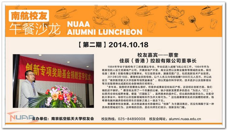 10月18日,第二期“南航校友午餐沙龙”邀请到了佳辰(香港)控股有限公司董事长、我校雷达专业80级蔡奎校友。同行的还有港倡有限公司总经理、我校航空自动控制系81级陈厚志校友。活动由发展联络部部长孙建红主持。 蔡奎校友建议大家在创业过程中,首先要考虑市场,“成功的关键是你是否能做到比市场领先,只需要半步!”,创业是商业与科技的结合,市场占据主导地位,他提醒创业的同学在产品生产环节务必要注意次品率与成本的关系,要用最简单的方法去解决问题。陈厚志校友建议同学们在学习功课之余,可以多参加创业相关活动,多去了解创业方面的知识并积累经验。参加此次活动的同学们受益匪浅,关于创业与创新的疑问均获得蔡奎校友的一一解答。