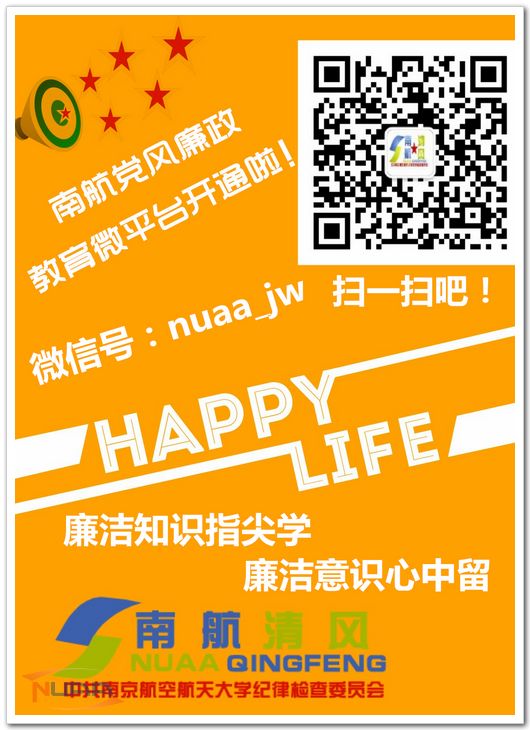 为充分借助微信这一新兴媒体平台,提高党风廉政教育的实效性,深入推进学校党风廉政建设,学校纪委开通并试运行“南航清风”党风廉政教育微信公众平台(微信公众号:nuaa_jw),暂设廉政动态、法纪释义、廉政箴言、微言大义、警钟长鸣、勤廉楷模、学思践悟、廉文摘编、廉评速递、漫话廉洁等栏目,定时通过图文并茂、生动活泼的方式,聚焦反腐倡廉热点,发布廉政资讯及动态,推送党纪政纪条规、法律常识等,传播廉洁知识,旨在培育和浓郁党员干部廉洁从政、教师廉洁从教、学生廉洁修身的校园廉洁文化,传递正能量,营造学校风清气正的育人环境和发展氛围。 学校党员干部、师生员工通过关注“南航清风”,可随时随地了解和关注上级反腐倡廉的最新精神、最新动态,及时知晓学校反腐倡廉的重大决策部署、重要通知,全面学习和掌握廉洁方面的党纪条规和法律法规等,使党风廉政教育和廉政提醒时刻在身边,真正实现“廉洁知识指尖学,廉洁意识心中留”,有助于实现党风廉政教育的常态化、长效化。