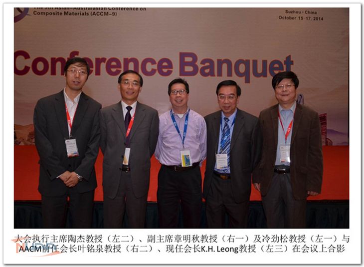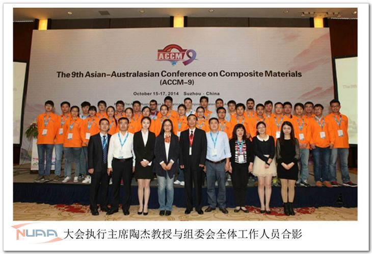 2014年10月15日-17日,由亚澳复合材料学会(The Asian-Australasian Association for Composite Materials,AACM)主办,中国复合材料学会、南京航空航天大学、江苏省复合材料学会、南京工业大学和江苏先进无机功能复合材料协同创新中心联合承办的第九届亚澳复合材料会议(The 9th Asian-Australasian Conference on Composite Materials ,ACCM-9)在苏州召开。 亚澳复合材料会议是亚澳地区乃至世界复合材料领域具有重要影响力的大型国际学术会议,每两年举办一次,旨在为复合材料领域的专家、学者提供高质量的国际学术交流平台,推动亚澳地区复合材料的繁荣发展。