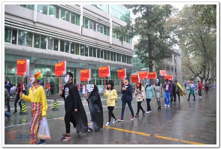 萌萌的小黄人、霸气威武的擎天柱、身着古装的狄仁杰,还有超级玛丽、蜘蛛侠、美国队长、绿巨人、蝙蝠侠等各种卡通形象齐聚南京航空航天大学明故宫校区一食堂门前,引起了来往学生的强势围观。原来,这是南航消防科组织举办的万圣节消防游园会活动现场,各种搞怪的卡通形象都是现身宣传消防知识的消防卫士。而这群小伙伴绝大部分是由南航的同学们扮演的。 “马上到万圣节了,我想同学们应该都对‘Trick or Treat’的万圣节活动感兴趣,因此就在校内发布征集帖,给大家一个机会装鬼要糖放肆捣蛋,摆脱作业的束缚狂欢一把,”南航消防科周栋栋老师笑着解释:“用一场狂欢来进行消防知识普及,既能达到教育的目的,也能享受一把万圣节的氛围,真的是一举两得。”