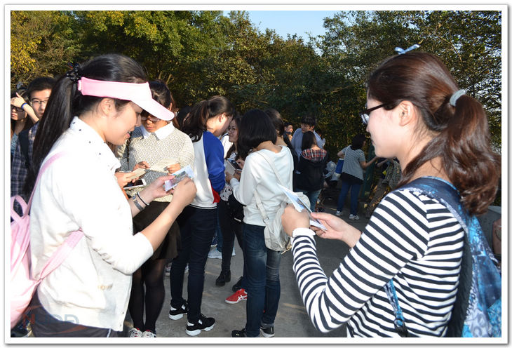 清晨时分,五所高校的研究生们来到本次活动的第一站:下马坊遗址公园。大家经过“你喜欢我吗?”、“一块五毛”等热身小游戏从陌生尴尬变得熟络起来。活动的第二个环节是在紫金山下的“流徽榭”野餐,大家纷纷掏出自备的饼干、糖果分享,有些同学还准备了沙包,在空旷的草地上嬉笑欢闹,仿佛瞬间回到了童年。随后,来自不同学校的同学们共分成六个小组,通过“隐形椅子”和“拍照比赛”两个竞技游戏决定各组登山顺序,进行爬山比赛。六个小组你追我赶,最终顺利”会师”山顶。大家在山顶上一边欣赏“一览众山小”的迷人风景,一边交换着彼此带来的明信片、小礼物。临近傍晚,同学们结队下山,此次的“绿色紫金行”活动在一片欢声笑语中落下了帷幕。