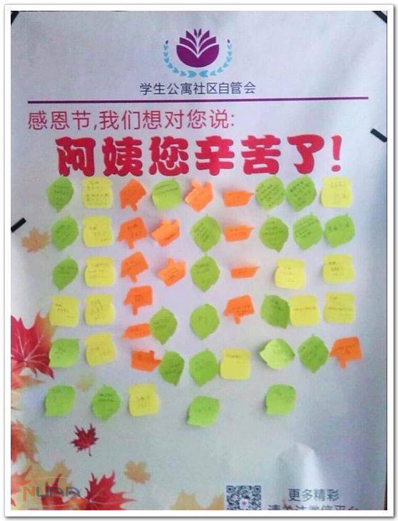 白底黄框的海报前上写满了“阿姨,辛苦你了”、“谢谢阿姨!”、“阿姨给的柚子很好吃,好评!”等话语,如果你在11月27日感恩节这天走过南京航空航天大学学生宿舍楼下,就会看到这样一幅情景。这是在南航“献给阿姨的情话”的感恩节活动现场,一大群学生围在通知栏前写写画画,把自己对阿姨的感激之情,通过文字和图画表现出来。 学生自发组织,参与热情高涨