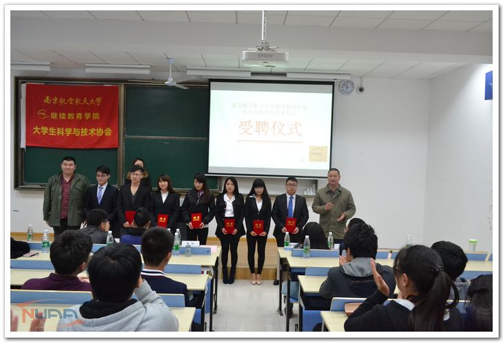 李学东读了《关于成立南京航空航天大学继续教育学院大学生科学与技术协会的决定》和科协第一届主席团名单,并颁发聘任证书。