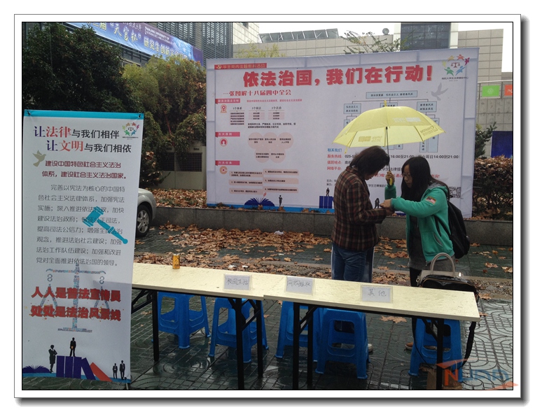 11月27日,法学专业学生在将军路校区樱花广场进行了普法活动,活动中,学生采取“一对一服务”的模式为前来咨询的同学们提供法律咨询服务,为将军路校区非法学专业的学生及教职工解答疑惑,并进行了相关登记与记录。28日,法学专业学生又在明故宫校区开展了普法活动,当天虽然下着雨,但还是阻挡不了同学们前来咨询法律问题的热情。另外,学院依托法律援助中心制作的有关“依法治国”相关法律知识的展板、海报进行十八届四中全会精神的普法宣传,旨在将“依法治国”的精神理念深深地渗透入校园,渗透入大学生的生活当中。同时在全校范围内征集法律故事,以法律故事的形式开展普法活动,让学生明白法律渗透在生活中的每个角落,在潜移默化中培育大学生的法治精神,让法治意识更加深入人心。