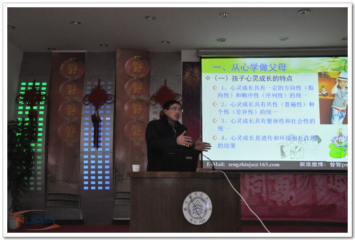家庭是孩子人生的第一所学校,家长是孩子人生的第一任老师。为了帮助南航教职工年轻家长更新亲子教育理念,促进孩子健康快乐成长,12月11日,校工会在西苑教职工活动中心五楼多功能厅举办了“现代家庭教育心理念”专题讲座。主讲嘉宾是南京中医药大学副教授、曾智博士。曾智老师是江苏省发展与教育心理专业委员会副主任;南京“市民学堂”、“南图讲坛”、“金图讲坛”主讲嘉宾。多次在中央电视台、江苏卫视等媒体担任嘉宾。曾智老师独立编著了我国第一套“亲子教育”系列丛书,深受广大读者的欢迎。