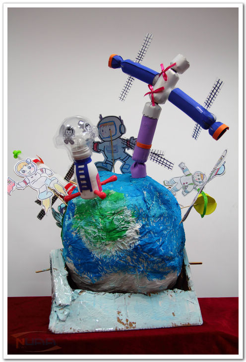 四个“萌妹子”捧着一个硕大的地球上台了,抢眼的蓝绿涂色,地球上插着宇航员、空间站、小卫星、着陆舱和其他与航天相关的小物件。“它的主体是用旧报纸做成的球,外面环绕的航天物件是用吸管、废旧灯泡、易拉罐等做的,用竹签插在球上。”团队队员方茜说,“我们叫它‘远航’,是表达我们对太空的好奇与想象。”团队最终还获得了“最佳环保奖”。谈到为什么会想到用上这些废旧材料时,方茜说,“平时注意细心观察,用上了之后会觉得很有意思。”