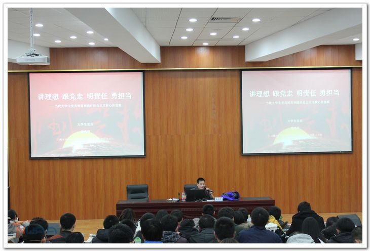 黄鸣阳以《讲理想跟党走,明责任勇担当》为主题,首先介绍了自己参加国家行政学院新党员培训班的体会和感受,然后从社会主义核心价值观的内涵展开,并就究竟什么是社会主义核心价值观,如何把握社会主义核心价值观的科学内涵与在场学生开展了讨论。随后,他就社会主义核心价值体系的基本内容、其地位功能及基本特征给予了解释。并指出二者之间的联系,即社会主义核心价值观为社会主义核心价值体系的凝炼做出相关解释。最后黄鸣阳向现场同学发出口号:国之多难兴邦,南航百炼成钢,我自奋发图强。呼吁南航学子不畏艰难,脚踏实地,爱国敬业,为社会主义事业贡献自己的力量。