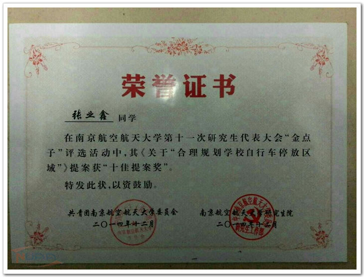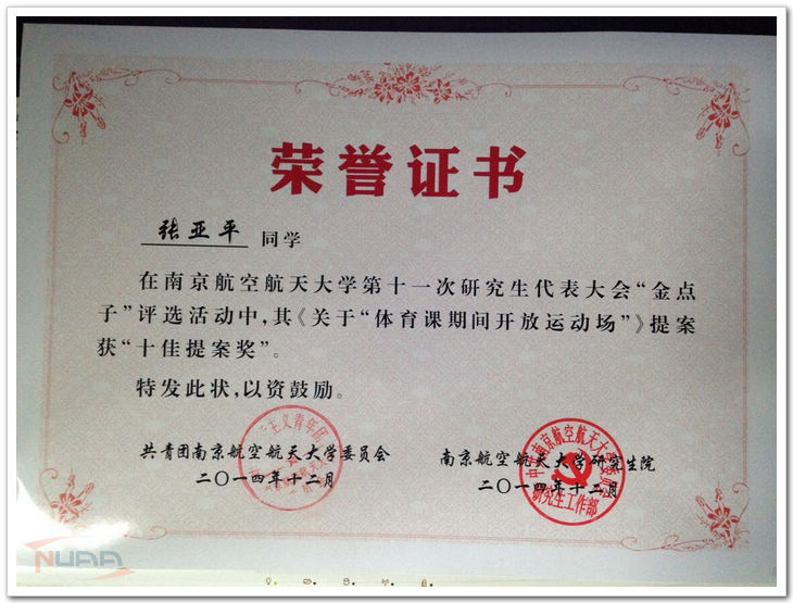 在南京航空航天大学第十一次研究生代表大会即将召开之际,由研究生院、校团委主办的校第十一次研究生代表大会“金点子”评选活动评选出了第十一次研究生代表大会“人气提案Top10”。 Top10中,有3份由航天学院研究生提出提案从全校近100项与研究生学习、生活息息相关的提案中脱颖而出,并最终通过网络投票的方式进入前10。这3份提案分别是杨斌的关于“加强研究生学业与社会需求相结合”的提案(位列第一),张业鑫的关于“合理规划学校自行车停放区域”的提案(位列第三)以及张亚平的关于“体育课期间开放运动场”的提案(位列第五)。