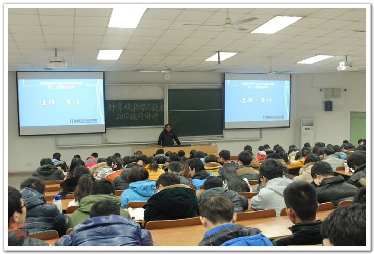 12月19日晚,计算机科学与技术学院2012级“选择与责任”主题月讲评在将军路校区举行。本次月讲评共分为“重申纪律”、“相处之道”、“选择与责任”、“学习和发展”四个部分。 会上,辅导员唐志文结合近期年级出现的一些问题和一年来年级工作中存在的不足,积极反思,总结经验教训,并再次强调各项纪律。临近期末,他再次重申了考试纪律,再次将学生手册中相关管理规定和处分办法向同学们详细解读,同学们也再次签下了自律承诺书。