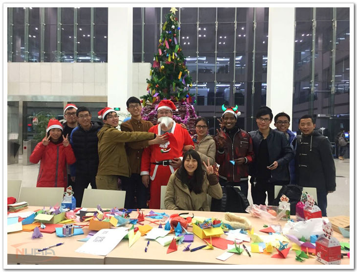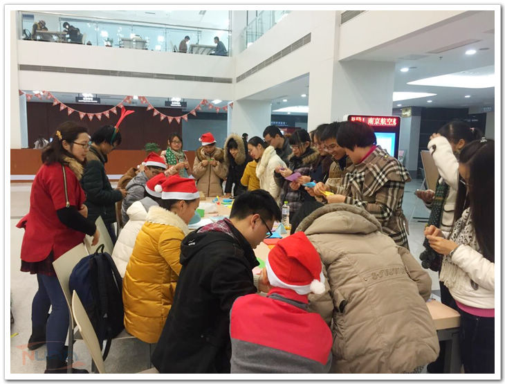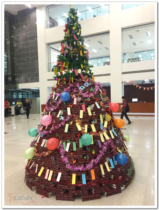 12月24日晚,将军路校区图书馆二楼大厅圣诞气氛浓厚,热闹非凡,由图书馆主办、图书馆志愿者协会承办的“平安夜 送平安”活动正在温暖举行。 大厅内有一棵用近800本精装图书搭建的圣诞树,是馆员老师带领志愿者们设计图纸,精心搭建三次才最终完成的,有创意又契合图书馆的氛围。图书馆馆员老师头戴圣诞帽,有条不紊地组织同学们开展各项活动。有折千纸鹤送祝福活动,同学们用彩纸精心折叠千纸鹤,挂在大厅,为自己的亲人朋友祈福;有悬挂祈福彩色纸条活动,同学们把自己的心愿写在卡片上,挂在圣诞树上,期望心愿的达成;活动的高潮是圣诞老人送祝福,图书馆馆员老师身着圣诞老人的服装,头戴圣诞帽,挂着圣诞老人的胡须,一出场便引来阵阵掌声和欢呼声,“圣诞老人”将糖果送给现场的每一位师生,并带着礼物袋走进阅览室,给努力学习的学子们送去美好的祝福。