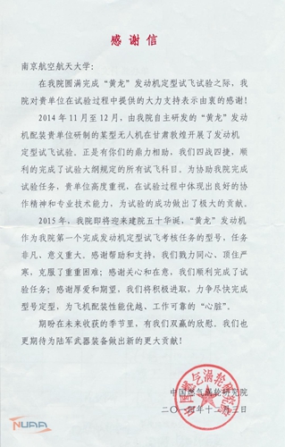近日,中国燃气涡轮研究院向我校发来感谢信,对我校在其自主研发的“黄龙”发动机定型试飞试验过程中提供的大力支持表示由衷的感谢。感谢信全文如下: