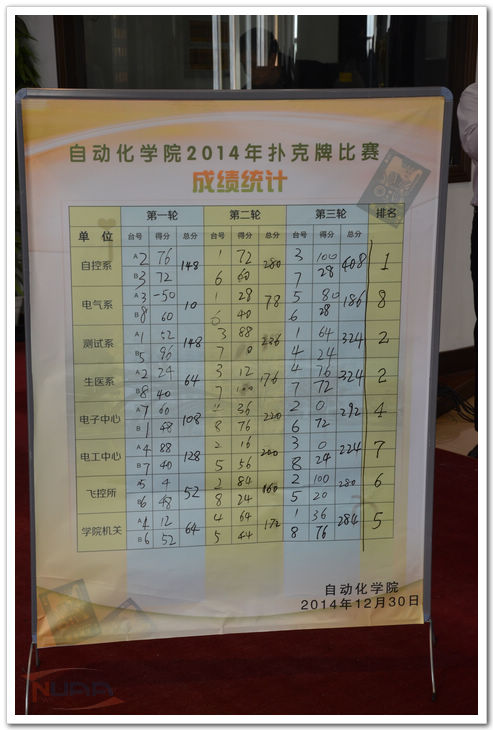 为欢庆元旦,丰富校园文化生活,加强全院各基层单位教职工间的相互交流,增强团队合作精神,自动化学院工会于2014年12月30日中午举行了教职工扑克牌比赛。来自学院8个基层单位的32名教职工经过2个小时的激烈角逐,最终自动控制系代表队获得一等奖;测试工程系荣获二等奖;生物医学工程系荣获三等奖。