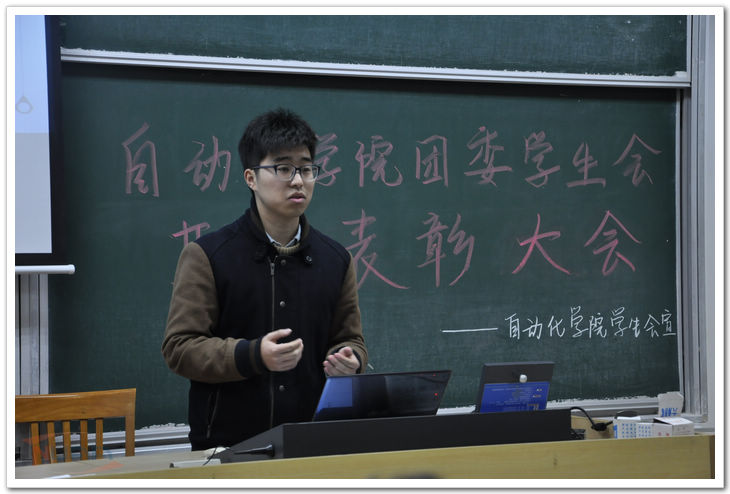 12月28日晚,自动化学院团委学生会期末总结暨表彰大会在将军路校区举行,学院14级辅导员徐萍以及院团委学生会全体成员参加了此次大会。 院学生会主席尤一韦首先上台发言,他对大家半年的工作和取得的成果做出肯定。他提出学院团委学生会要向服务型学生组织转型,在完成工作的同时每个人要有更多维度和更高层次的思考,不能仅停留在完成任务的层面;院团委学生会的众多部门虽然有分工和差异,但只要部门成员对各自部门的核心职能有足够的认识,就能更好的完成学生工作。最后他建议大一大二的同学在成长过程中要多读书,多和有经验的前辈们交流。