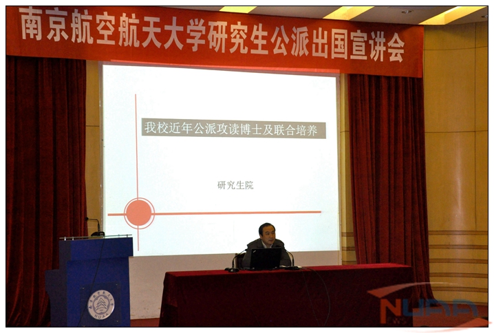 1月13日下午,南京航空航天大学2015年国家公派研究生项目宣讲会在逸夫科学馆报告厅顺利召开,会上我校研究生院、国际合作与交流处相关领导就我校近年公派情况、2015年公派留学政策、申报流程及相关注意问题进行详细的解读, 学院老师及学生代表详细介绍建立海外联系渠道和成功申请国家留学基金经验。本次宣讲会共有250余名学生参加,持续两个小时,现场气氛热烈。 宣讲会上,研究生院常务副院长、研工部部长江驹教授介绍了近年来我校研究生国际化工作开展所取得的成绩,并鼓励学生积极参加公派出国、联合培养、交流交换、短期访学、国际会议等国际交流项目,并通过出国交流进一步增长见识和生活阅历,提高科研学术水平。他在报告中还总结了我校研究生近年攻读博士及联合培养概况,并详细介绍2015年研究生公派计划,提示学生们在申请公派项目时,需制定合理留学计划,参照国家留学基金委的政策及流程做好申请准备,并最后预祝更多的学生能够成功申请2015年研究生公派项目。