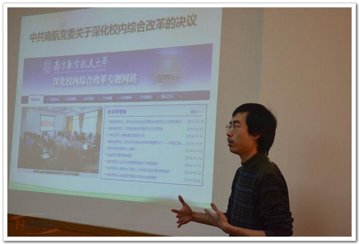 活动分为两部分,首先是主题发言。信息中心主任袁家斌教授代表信息中心党支部发言。他说,时光易逝,岁月易老,记得去年我们是在12号楼与同学们聊理想,谈梦想,今年是在11号楼,或许明年我们将在将军路校区进行支部活动了。袁老师动情的开场白迅速拉近了师生们的距离,他接着说,今年是学校深化校内综合改革关键的一年,改革已步入深水区,我们要有壮士断腕的决心和挖骨疗伤的勇气,希望各位党员从信息化的角度献言献策,畅聊信息化建设在校内综合改革中的作用。随后,四名研究生党员同学作了主题发言,他们分别从自己的学习、生活经历出发,以调研资料为论据,提出了涉及人事制度、人才培养机制、科研管理机制、校院管理体制机制四个领域的多项建设性建议。其中朱快快同学提到大师的重要性,学校要重视高级人才的引、培举措;臧思聪同学通过对比其他高校改革举措,认为我校改革到了迫在眉睫、不得不改的地步了。其他同学也提到了大数据分析在管理中的应用、数据共享的重要性、建立云平台实现一站式管理等举措,会场不时地响起阵阵掌声,学生们纷纷以主人翁的姿态积极探索我校深化校内综合改革前进之路。活动第二部分,是高等教育改革及南航校内综合改革知识竞答。通过近30道关于南航深化校内综合改革精神和相关举措的知识竞赛,大家进一步领会了校内综合改革的重要性和意义。