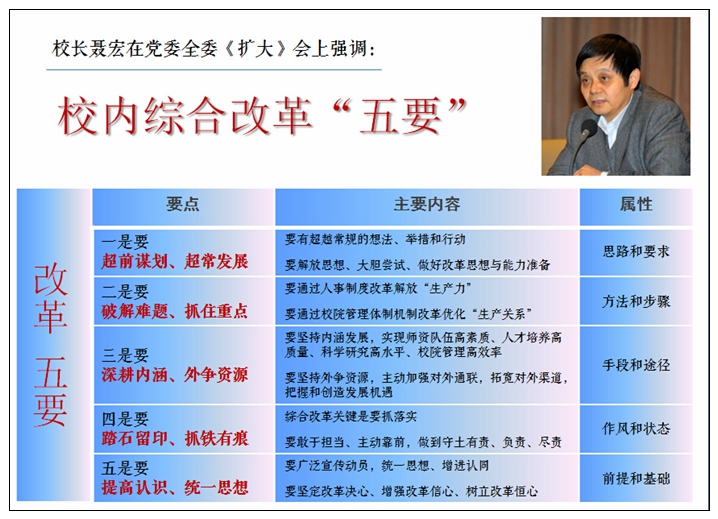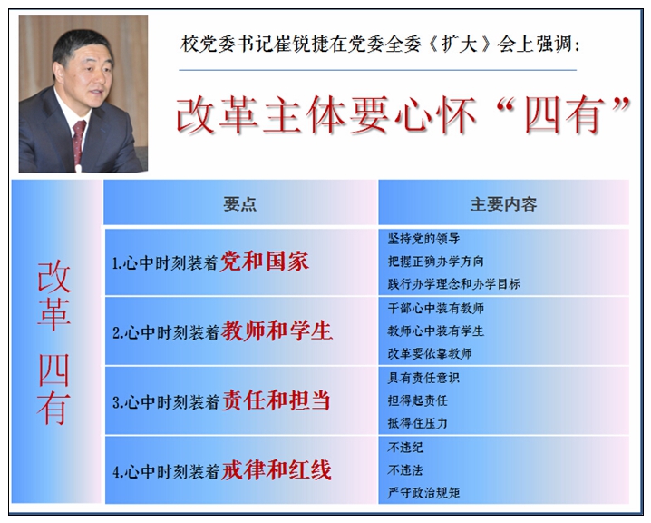 “深化校内综合改革,心中要时刻装着党和国家,时刻装着教师和学生,时刻装着责任和担当,时刻装着戒律和红线。”3月4日,我校召开第十五届党委第十三次全委(扩大)会议。校党委书记崔锐捷主持会议并讲话,校长聂宏代表学校党委向会议作了工作报告。 崔锐捷在讲话中,引述了习近平总书记在同中央党校第一期县委书记研修班学员进行座谈时的讲话精神,党员干部要始终“心中有党、心中有民、心中有责、心中有戒”。结合习总书记讲话精神和我校改革发展实际,崔锐捷向全校师生提出四点要求。 ![]() 一是心中时刻装着党和国家。要在党和国家的正确领导下,坚定不移把握正确办学方向。结合学校实际,就是要做到时刻践行学校的办学理念、培养目标、办学目标。 二是心中时刻装着教师和学生。对于教师来说,心中要时刻装着学生,想把改革搞好,就要依靠教师。干部心中装有教师,教师心中装有学生。如果干部心中有老师,将会一往情深;教师心中有学生,则会充满爱心,当二者兼备时,才会培养出高素质公民和未来开拓者,把握好改革的方向。 三是心中要时刻装着责任和担当。学校要发展转化为学院要发展,而学院的发展则要依靠各个学科的改革和发展,这就要求我们的领导干部具有责任意识,担得起责任,抵得住压力。 四是心中要时刻装着戒律和红线。广大党员干部要时刻严明政治纪律和政治规矩,不违纪、不违法,以坚强的组织保障,确保改革的正确方向。 聂宏指出,2014年,在工业和信息化部、江苏省委、省政府的正确领导和大力支持下,学校党委团结带领全校师生员工,深入贯彻党的十八大和十八届三中、四中全会精神,坚持以“三个为本、三个促进”的办学理念为指导,不断巩固党的群众路线教育实践活动成果,全面深化校内综合改革,扎实推进“一提三优”工程(二期)建设,学校各项事业均取得了新进展、新成效。 ![]() 聂宏强调,2015年是“十二五”规划的收官之年和“十三五”规划的奠基之年。这一年学校将重点推进四个方面的工作。一是全力推进校内综合改革,有效促进学校内涵发展;二是全面落实各项建设任务,不断增强学校综合实力;三是积极推进办学资源争取和办学条件建设;四是不断推进党的各项建设,为学校发展提供有力保障。此外,其它各项工作都要在校党委、行政的统一领导下,围绕学校中心工作,坚持高标准、严要求,不折不扣地完成年度任务,为全面实现“十二五”建设目标提供坚实保障。 会上,校党委副书记、副校长陈夏初代表学校党委向与会人员传达了第二十三次全国高校党建工作会议、全国工业和信息化工作会议和江苏省教育工作会议精神。 视频制作:南航电视台 ![]() ![]() ![]() ![]() ![]() ![]() ![]() ![]() |