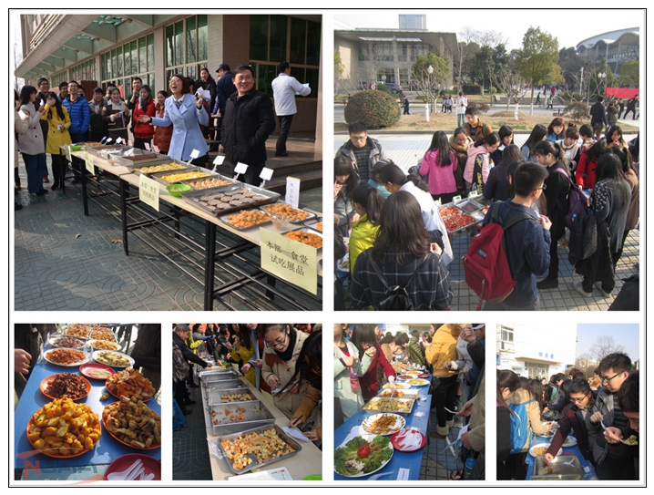 下午,现场服务咨询及美食展销在明故宫校区二食堂门口与将军路校区樱花广场同时开始。在服务咨询台,吸引了众多同学进行反映问题、建言献策,后勤各中心负责人一一进行了详细解答与记录。在美食展销区,瞬间聚满了人群,他们为各食堂精心制作的各色美食所吸引,每一道都是那么的让人垂涎欲滴,恨不得一下收入囊中;最让人羡慕的是现场的学生“试吃员”,不仅能对食堂新推出的各色美食新品试吃、打分,还能获得一张10元免费餐券;在 “转圆盘、答问题、赢惊喜”食品安全知识宣传一角,众多同学踊跃参加,人声鼎沸,将活动现场气氛推向了高潮。“试吃好开心啊,这么多新品免费吃,而且还能获得餐劵,哈哈,想想都很兴奋啊”,试吃员侯同学开心的说到;“嘻嘻我不仅免费试吃了新品,还通过回答问题赢取了一瓶饮料,果然是好吃配好喝,下午茶更完美啦”,刚刚试吃结束的杨同学拿着赢来的饮料兴奋地“炫耀”到…… 统一着装的公寓阿姨、叔叔们现场免费为同学们修理小家电、配钥匙、缝补衣物,也组成活动现场一道靓丽的风景线。