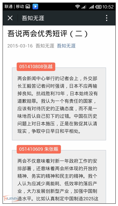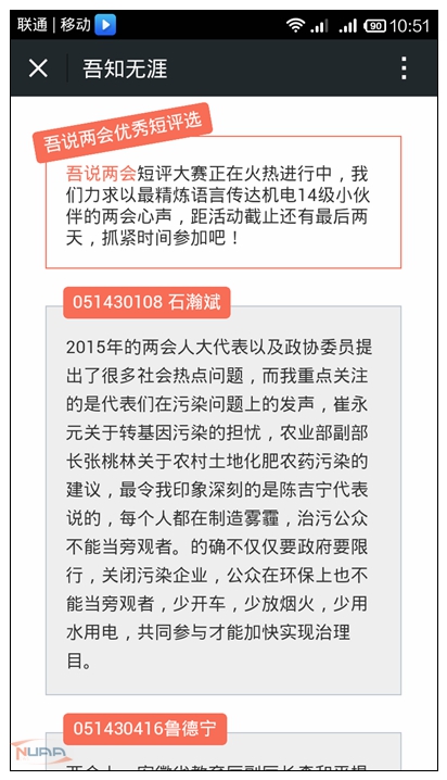 来自各团支部的五位同学依次走上讲坛,分别围绕“高级人才流失、废除嫖宿幼女罪、穹顶之下的环境保护、大众创新万众创业、反腐倡廉建设”等五个方面的内容阐述了自己的看法。他们的阐述内容丰富,见解独到,体现了他们扎实而广博的知识积累。从他们的阐述中,不难看出他们对社会进步、祖国繁荣、民族振兴的殷切期盼。 ![]() 2014级辅导员王洋最后总结了此次论坛,他充分肯定了各位同学对国事民生的积极关心,希望同学们能够立足平时,学会观察,培养全面而理性思考问题的能力,学会从历史中汲取营养,站在更高的理论层次展望社会的发展。他号召同学们能够承担起历史与时代赋予的责任,争做高素质公民与未来开拓者。 本届两会是我国在全面深化改革、全面实施依法治国背景下召开的,意义之大、地位之重不言而喻。“吾说两会”主题教育活动,通过研讨沙龙、短评大赛、主题论坛等多元化的形式,积极引导同学关心时事政治,情系社会民生,不仅有利于培养学生的社会责任感,而且能够激励学生勤勉于学,自立自强,为实现伟大中国梦而不懈努力。