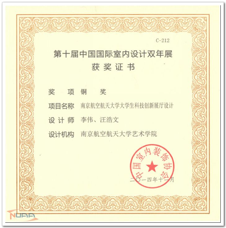 近日,中国室内装饰协会主办的“第十届中国国际室内设计双年展”在北京隆重开幕,由我院设计类专业师生选送的室内设计作品共获得四个奖项,其中专业教师李伟、汪浩文的设计作品《南京航空航天大学大学生科技创新展厅设计方案》获得铜奖,研究生唐琳云团队、宋方启团队、崔灿团队设计作品分获优秀奖。