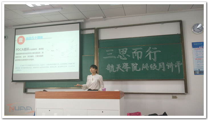 4月1日,航天学院14级辅导员刘洁在2014级学生中开展“三思而后行”月讲评活动。 首先,辅导员就同学对工作策划的认识与态度引出了"三思"中的"事前思考"。她认为,在座的每位同学都应对未来的生活做一个规划。只有按照既定的规划走,才不会到了毕业时干着急。规划其实并不是一种浮于形式的空想;它应该是融入了自我的思考,是根据自身实际对以后的路进行的设计。可以从辅导员的话语中概括出:一个好的规划是理想的未来的基础。 其次,就"三思"中的"事后反思",刘洁辅导员提出了管理学中的PDCA循环。虽然它多被用于对他人的管理上,不过也同样适用于自我约束。其中最重要的就是C- check,它代表着反思与总结。导员认为,既需要总结成就,树立信心,也需要总结不足,找寻方向。紧接着同学们交流了自己的反思情况。事实证明,大多数同学在这方面有所欠缺。辅导员针对这一点提出了一些方法,如:"我眼中的我",即自我总结。"你眼中的我",即通过他人的批评和表扬来认识自我。"默"的意识,即发呆,不过这种发呆要求我们脑中要想一些问题,比如说:我们有没有在众人面前认真的谈谈自己的感受?我们有没有认真地听过一节课?我们有没有与同学深入讨论过,抑或是与同学吵架?我们有没有经常锻炼身体?我们有没有对一件事情付出100%的努力,即使是谈恋爱? 在就上学期期末成绩以及素质能力培养两方面对全院学生进行总结,引发多方思考之后,强调“让总结成为习惯俨然”这个主题。 同时,借助月讲评的契机,学院进行优秀团员以及优秀团干的公开投票环节,最终每班选出3名优秀团员,学院选出6名优秀团干。 "事前思考,事中思路,事后反思",“三思而后行”,加上个人努力,定能找到"自由"与"自律"之间的最佳平衡,走出迷茫,走出困境! ![]() ![]() |